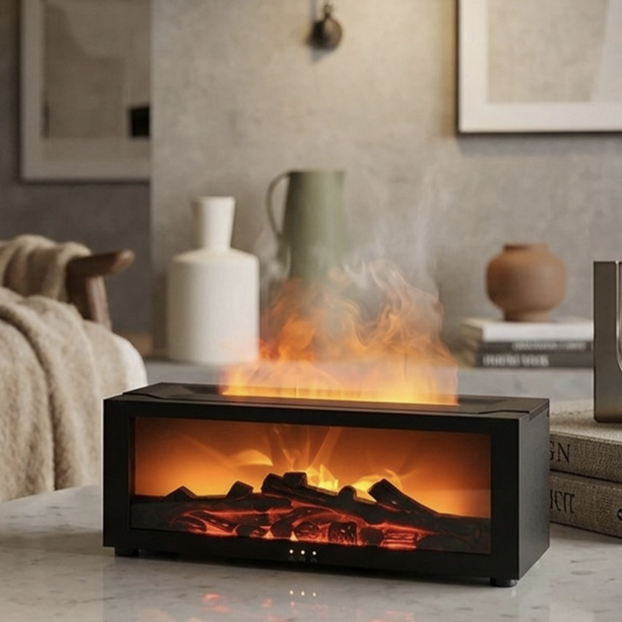 炎のゆらぎを再現したライトと、アロマ対応の加湿機能を備えた、卓上タイプのアロマディフューザーです。やさしい光と香り、そして適度な潤いが、室内に落ち着いた時間をもたらします。